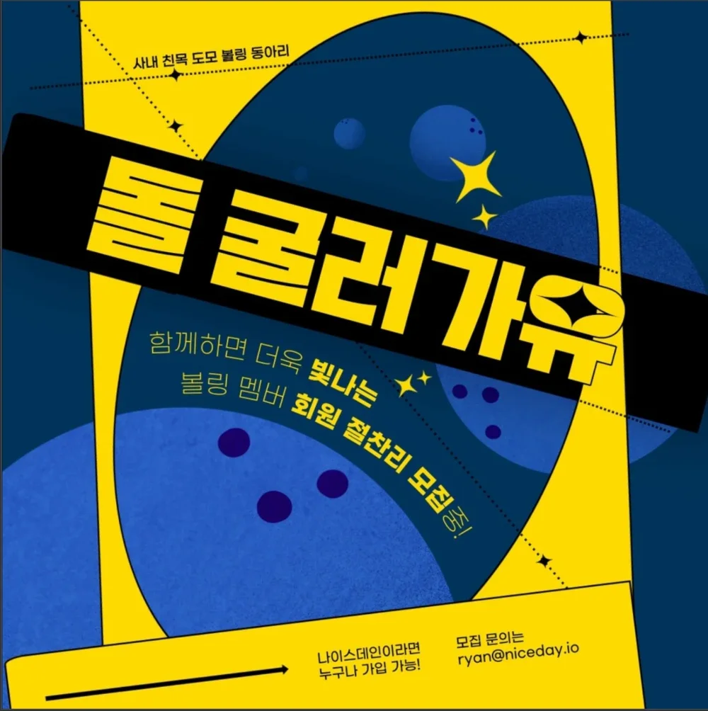 저는 이를 충족시키기 위해 나이스데이 슬랙 채널에 볼링 동아리 모집 공지를 올렸습니다. 그리고 디자이너 분께서 모집 포스터도 만들어주셔서 볼링 동아리 회원 모집하는데 큰 도움이 되었습니다.