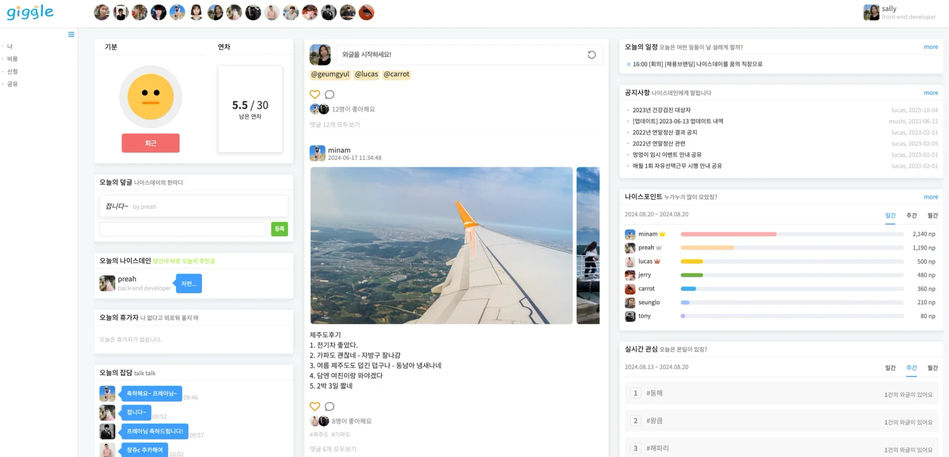 giggle์๋ ๊ทผ๋ฌด/ํด๊ฐ ๊ด๋ฆฌ, ์ค๋์ ์ผ์ , ๊ณต์ง ์ฌํญ ๋ฑ ๋ค์ํ ๊ธฐ๋ฅ๋ค์ด ์์ง๋ง, ํนํ ์ ์ฉํ๋ ๊ฒ์ ๊ตฌ์ฑ์์ ์๊ฐ์ ํผ๋ ๊ธฐ๋ฅ์ด์์ต๋๋ค.