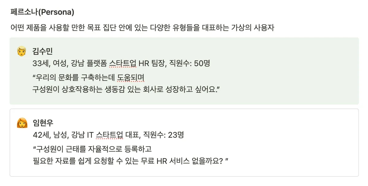 고객 페르소나와 비슷한 규모의 회사에서 근무하고 계시며 조직문화에 대한 관심까지 부합하여 많이 놀라웠습니다.