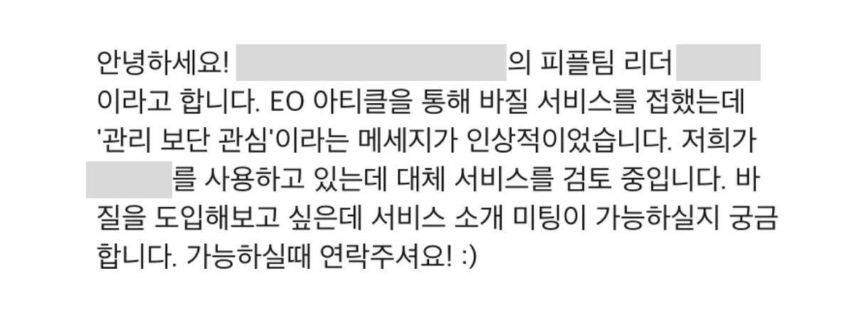 마찬가지로 기존의 HR 서비스를 대체하는 의사결정을 내려야 하는 만큼 동료분들과 함께 긍정적으로 검토해 보겠다는 답변을 받았습니다.
