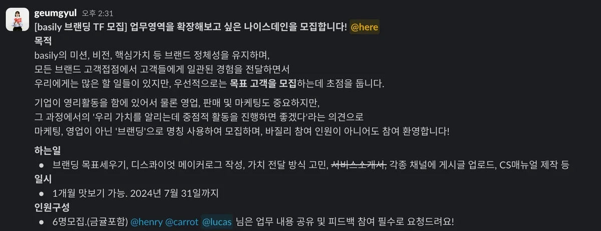 다양한 도전을 시도하고 있는 Branding T/F에서 어떤 결과를 만들어내고 있는지, basily의 가치를 높이는 일이라면 Branding T/F에서는 끊임없이 새로운 아이디어와 전략을 모색하며 발전해 나가고 있습니다.