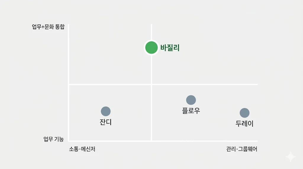 주요 기능 | 대화방, 파일 공유, 화상회의 | 업무 5단계, 간트, OKR | 메일, 결재, 근태, 위키 | 업무 관리, 인정/칭찬, 바질 포인트 |